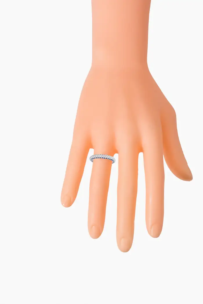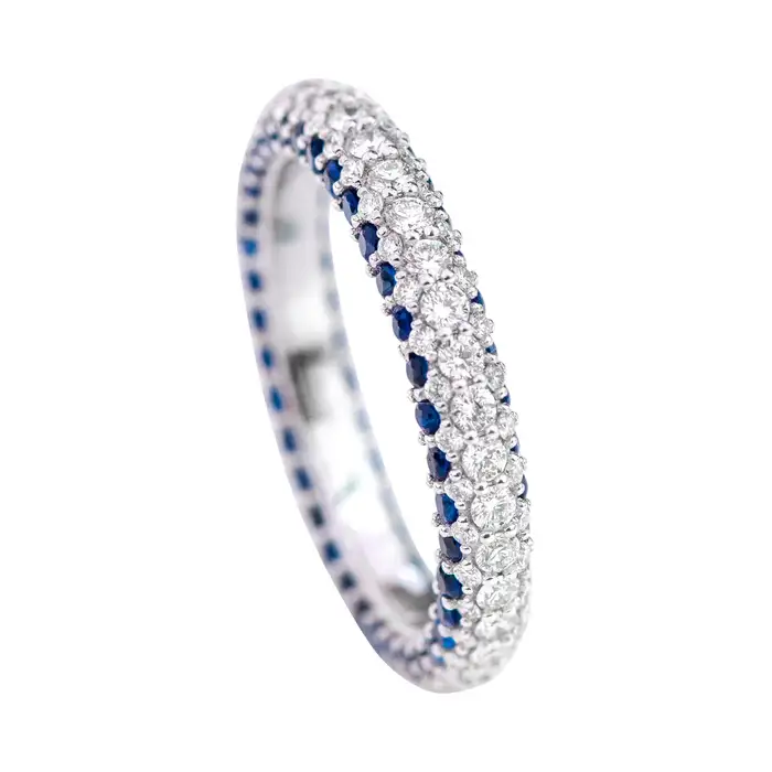 這款永恆戒指的藍寶石總重量為 1.16 克拉,鑽石重量為 1.05 克拉,展示了一排閃閃發光的寶石,象徵著永恆的愛情。