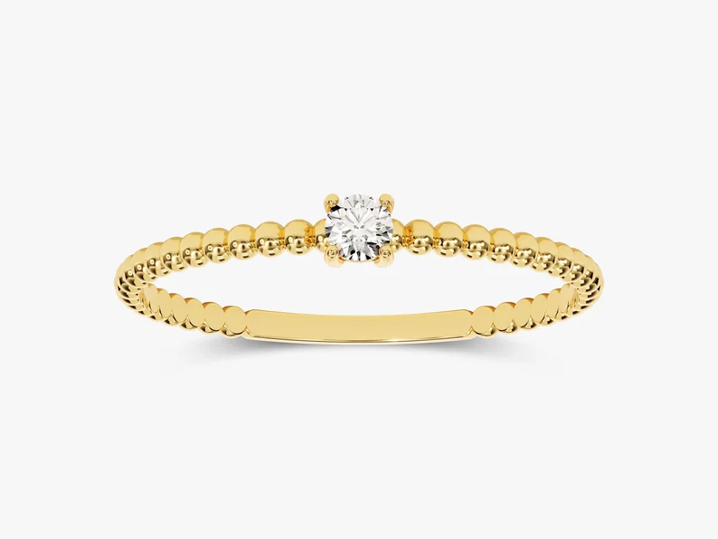 這 14K純金串珠鑽石戒指 特點 0.05 克拉圓形 VS-SI 淨度,IJ 顏色單顆鑽石 鑲嵌在精緻的串珠帶上,非常適合疊戴或單獨佩戴。