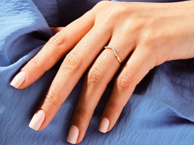 戒指展示 9顆圓形鑽石 總計 0.24克拉,每一個都經過精心挑選,以達到最佳效果 GH 顏色和 VS-SI 淨度,閃耀奪目,光彩奪目。獨特的弧形設計確保佩戴舒適,與訂婚戒指完美搭配,為您的造型增添和諧柔美的氣息。