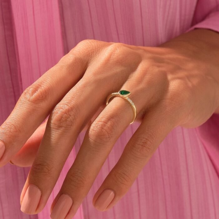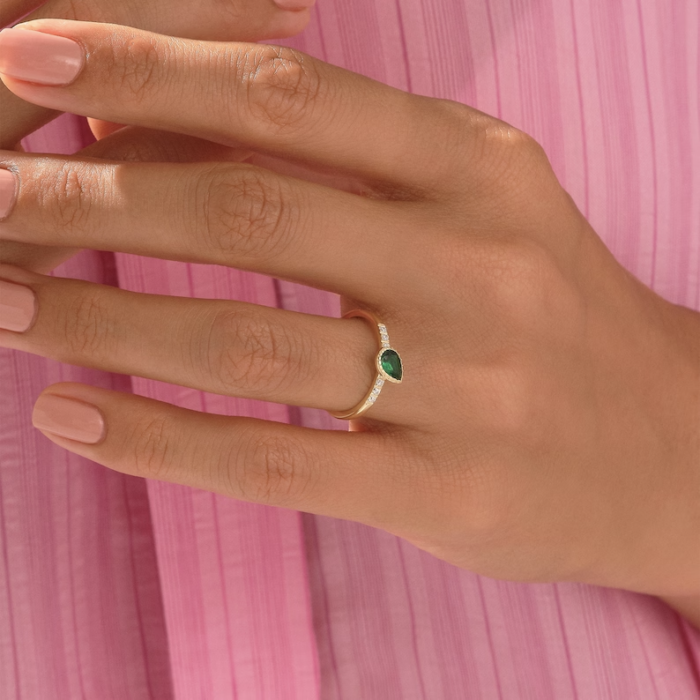 這款祖母綠梨形戒指採用優質14K金打造,鑲嵌一顆令人驚豔的天然祖母綠——五月的誕生石,包鑲工藝使其散發出令人心動的魅力。這位祖母綠重0.35克拉,尺寸為6.15毫米 x 5.85毫米,深邃的綠色散發著濃鬱的光澤和活力。