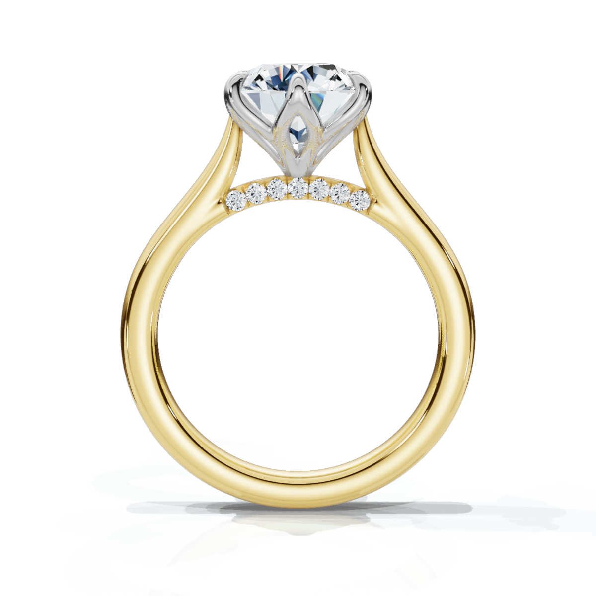 這款 14K 純金訂婚戒指採用精緻的鬱金香形鑲嵌,鑲嵌一顆莫桑石鑽石,散發出優雅的魅力和永恆的光彩。