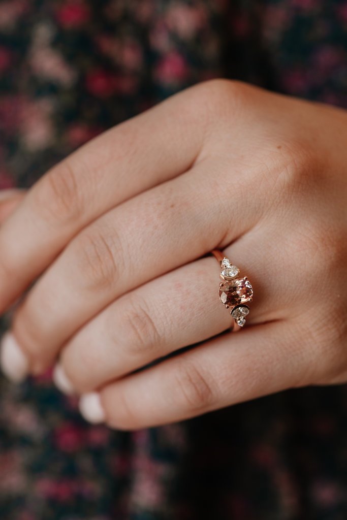 深粉紅色的石榴石與實驗室培育的粉紅色鑽石形成了絕妙的對比,使這件作品不再是沉悶的浪漫。