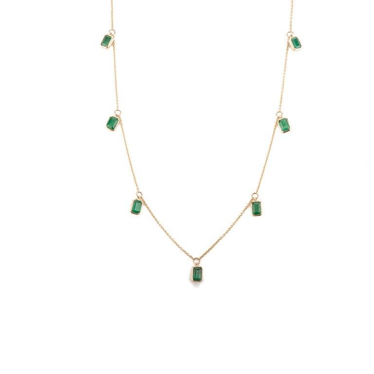 這款項鍊採用14K純金打造,鑲嵌七顆璀璨奪目的祖母綠,總重4.06克拉。每顆祖母綠尺寸為7 x 5毫米,展現出其璀璨的翠綠和精湛的切割工藝。祖母綠串飾均勻分佈在17.5英吋長的鏈條上,營造出平衡和諧的視覺效果。