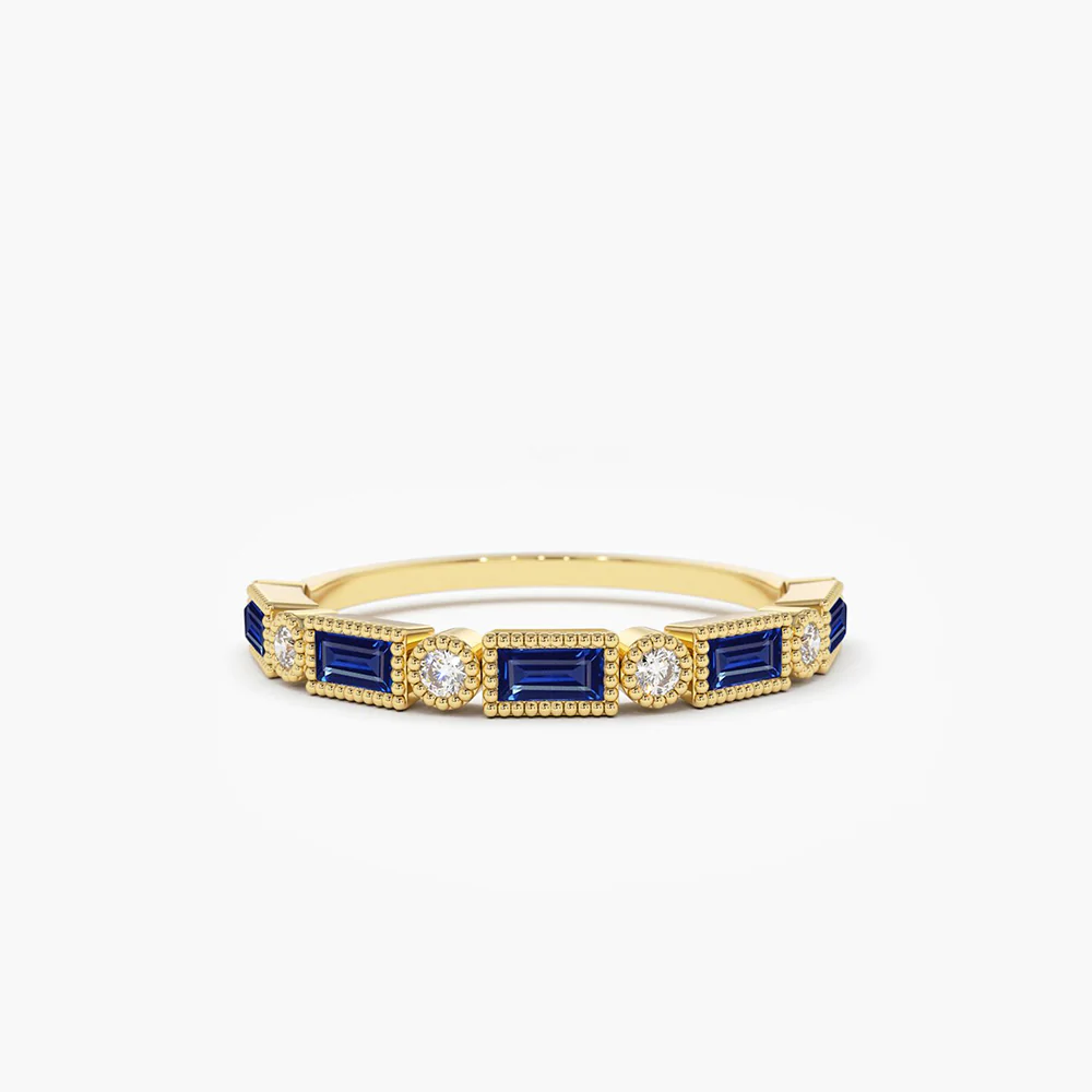 增添一絲精緻優雅 14K 純金長方形藍寶石和鑽石戒指。