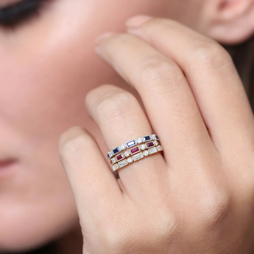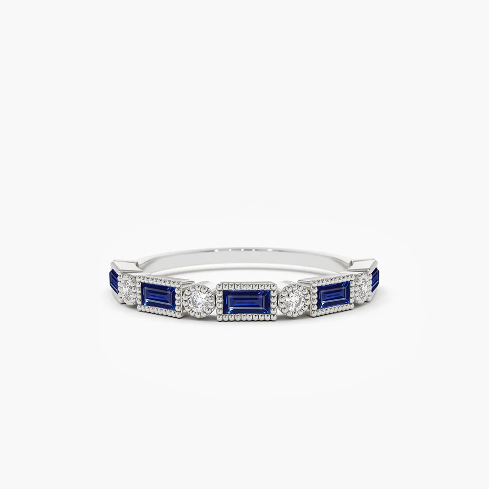 這款戒指鑲嵌五顆長方形藍寶石,每顆尺寸為 3.25 x 1.50 毫米,鑲嵌得當,營造出流暢的美感。六顆圓形鑽石,每顆尺寸均為 1.50 毫米,閃耀奪目。鑽石總重 0.12 克拉,顏色等級為 G,淨度等級為 SI,展現出璀璨的光芒和卓越的品質。