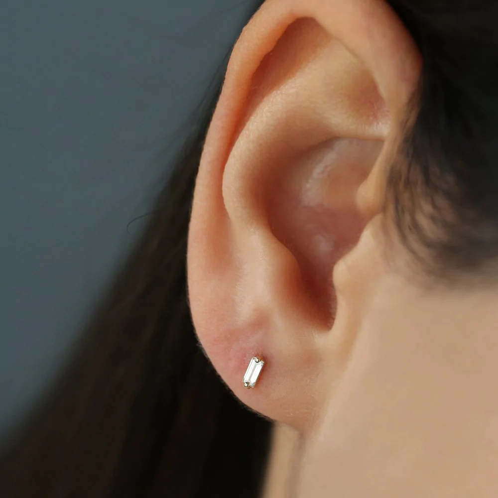 製作於 14K純金,可在 白金、玫瑰金和黃金,這些螺柱 BIS 標記 追求真實性和品質。憑藉其 緊湊型 5 x 1.75 毫米鑲嵌,它們非常適合堆疊、二次穿孔或單獨佩戴,以呈現簡約的美感。