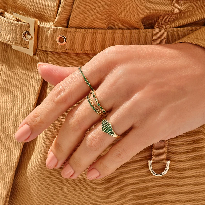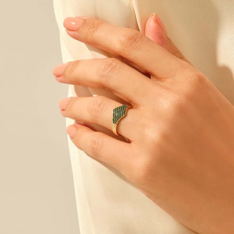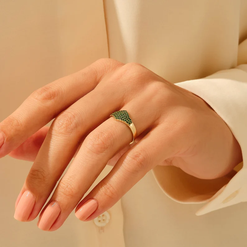 優雅的 18k 純金祖母綠密鑲印章戒指,結合了鮮豔的祖母綠和密鑲細節,打造出現代而精緻的宣言作品。
