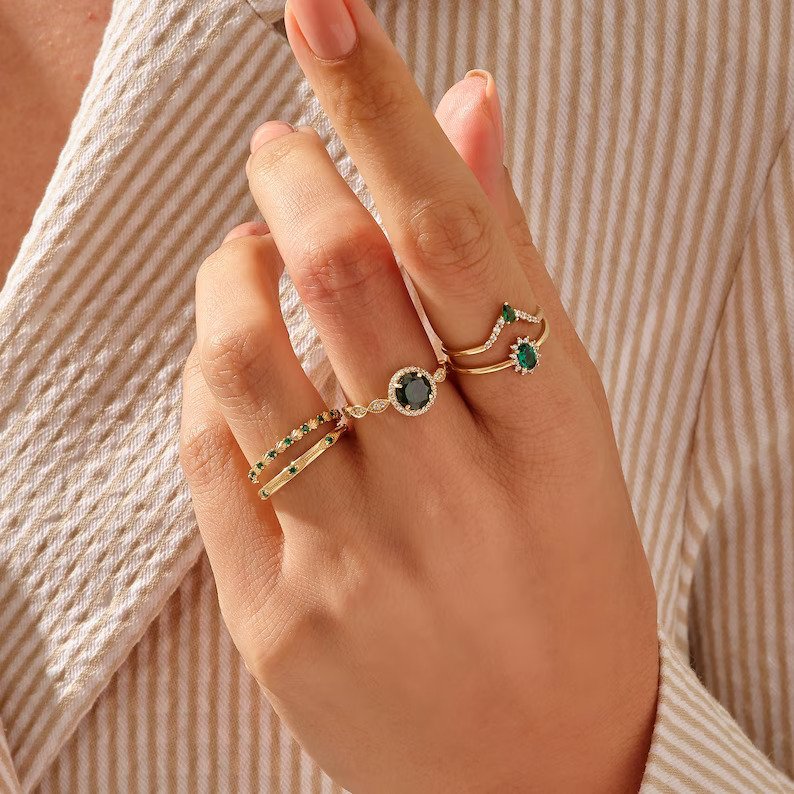 光滑的 18k 純金戒指,以簡約的鑲嵌方式,鑲嵌一顆橢圓形切割祖母綠——具有現代優雅、豐富的色彩和永恆的魅力。