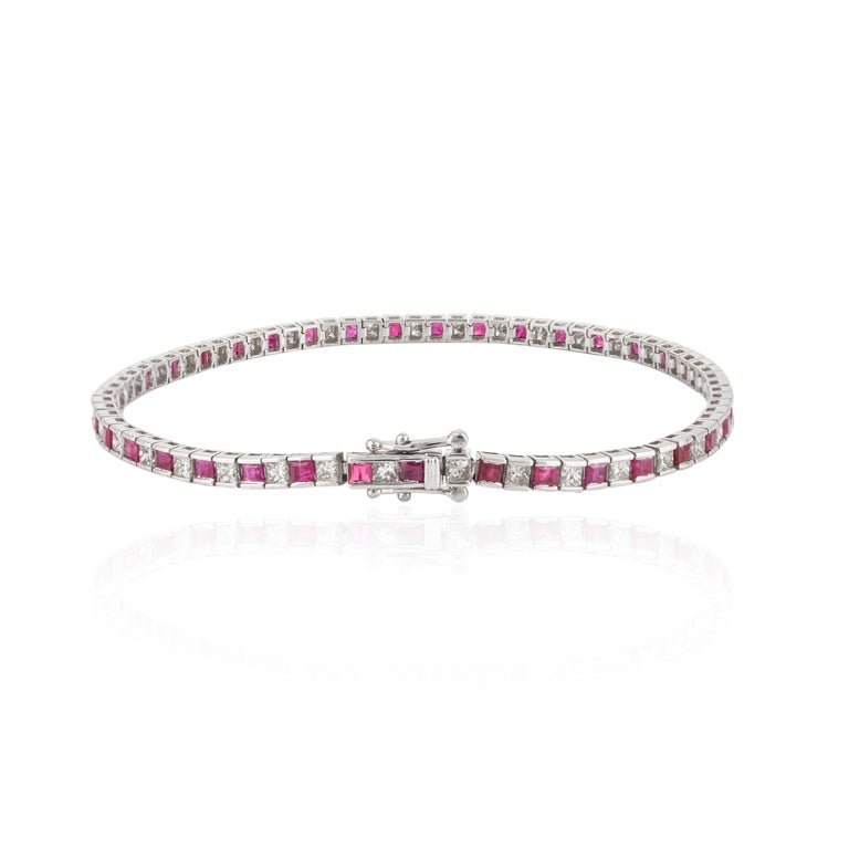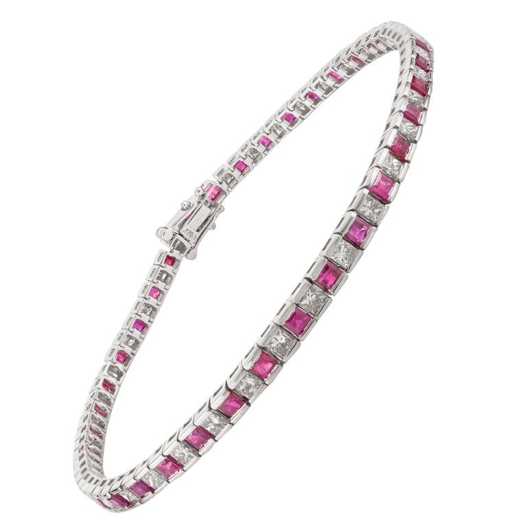 盡情享受我們奢華的美麗 18k 純金紅寶石鑽石網球手鍊,一件工藝精湛、優雅非凡的傑作。這款手鍊採用優質18K純金打造,鑲嵌著公主方形切割紅寶石和圓形鑽石,令人驚艷。