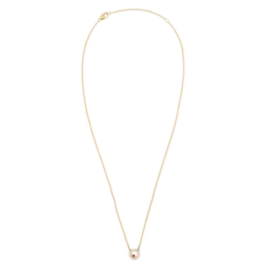 這款18K金紅寶石鑽石項鍊製作精良,注重細節,展現卓越的工藝與品質。光滑拋光的金鍊與寶石的璀璨光芒相得益彰,營造出金屬與色彩的和諧平衡。