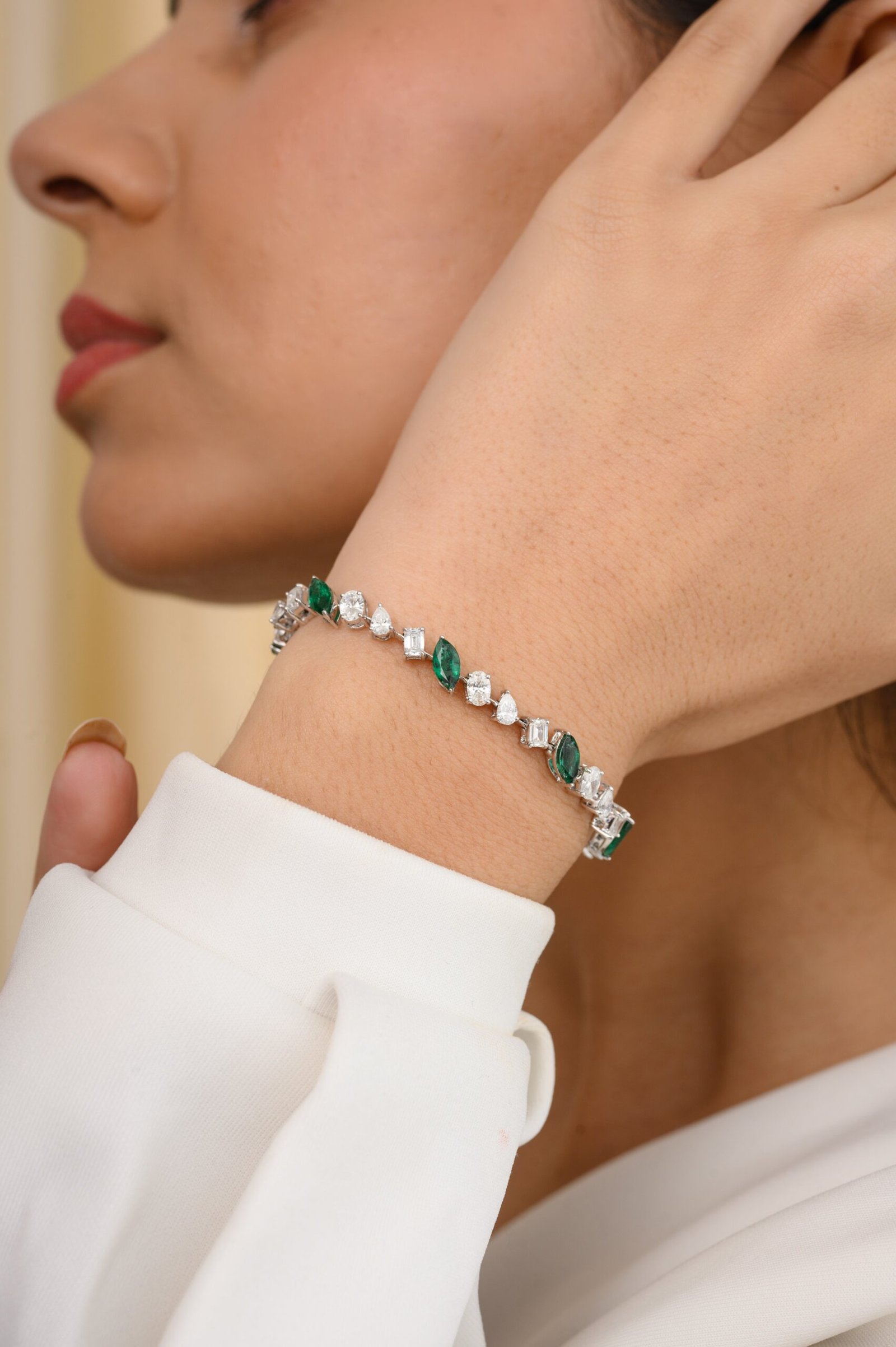 用華麗的 18k 純金祖母綠和鑽石網球手鍊提升您的風格,這是一款奢華的配飾,捕捉了永恆的美麗和優雅的精髓。
