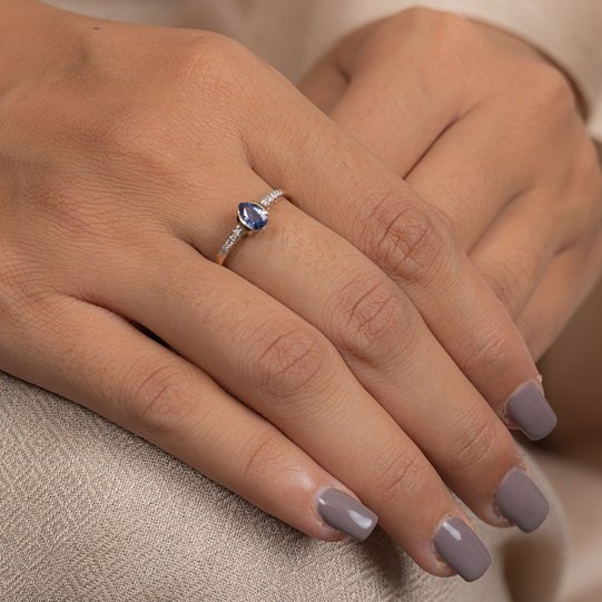 沉醉於永恆的優雅之中 18k 純金藍寶石戒指。 這款令人驚豔的戒指採用18K純金打造,以其濃鬱的色澤和持久的品質而聞名。這枚精緻戒指的中心鑲嵌著一顆迷人的梨形藍寶石,重0.45克拉。這顆藍寶石尺寸為6 x 4毫米,呈現出深邃而鮮豔的藍色,令人眼前一亮,散發著奢華與精緻的氣息。