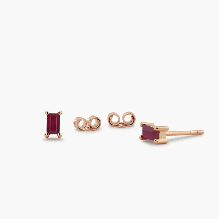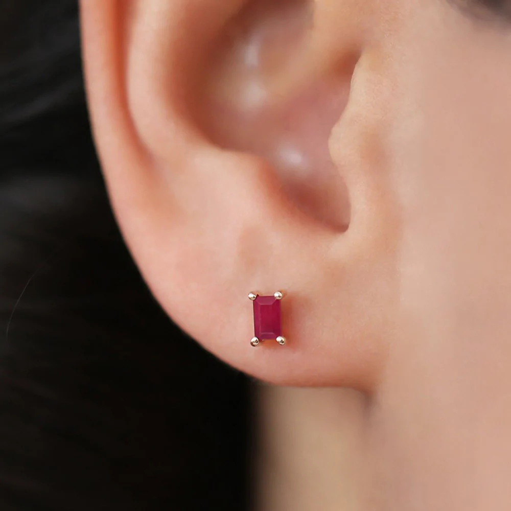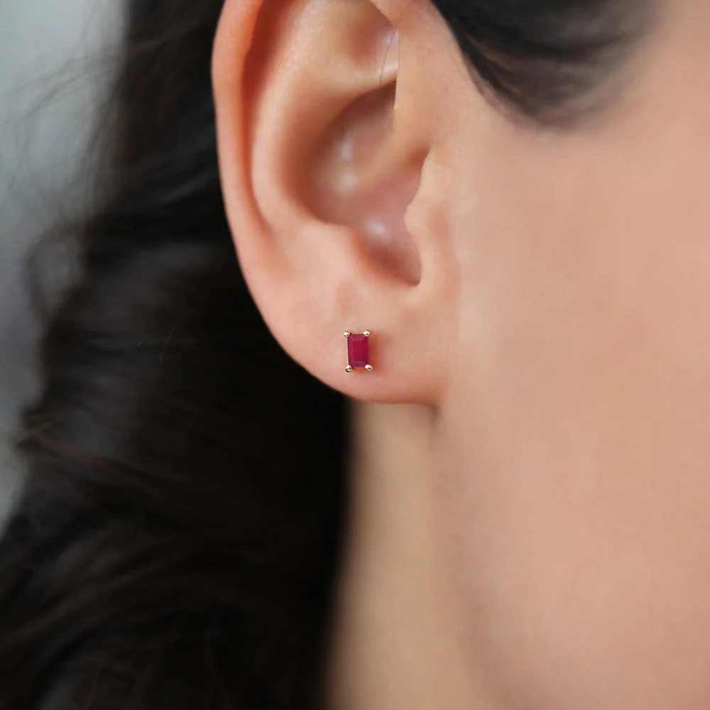 優雅的 18k 純金耳環,鑲嵌有長方形切割紅寶石,設計時尚永恆,為任何造型增添一抹色彩。