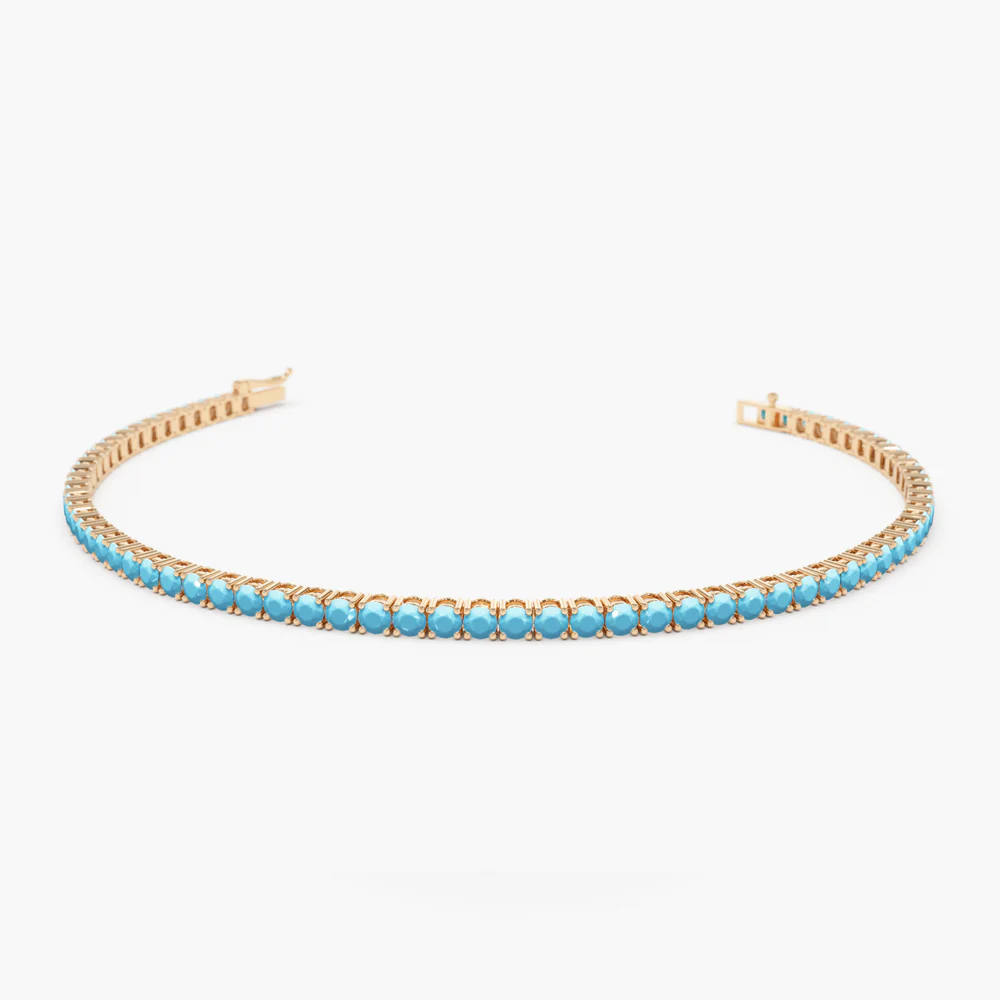 這 18k 純金爪鑲綠松石網球手鍊 是永恆優雅與活力之美的完美融合。 純淨的綠松石寶石 固定在 經典四爪鑲嵌這款手鍊象徵寧靜、守護和精緻。綠松石的明亮藍色調與溫暖的 18k純金,打造出引人注目的配件,毫不費力。