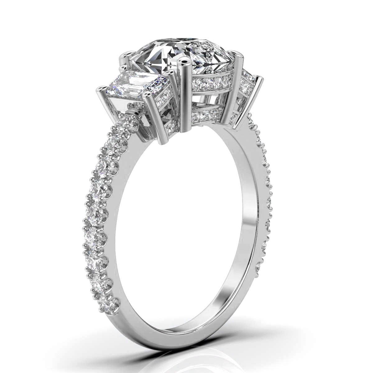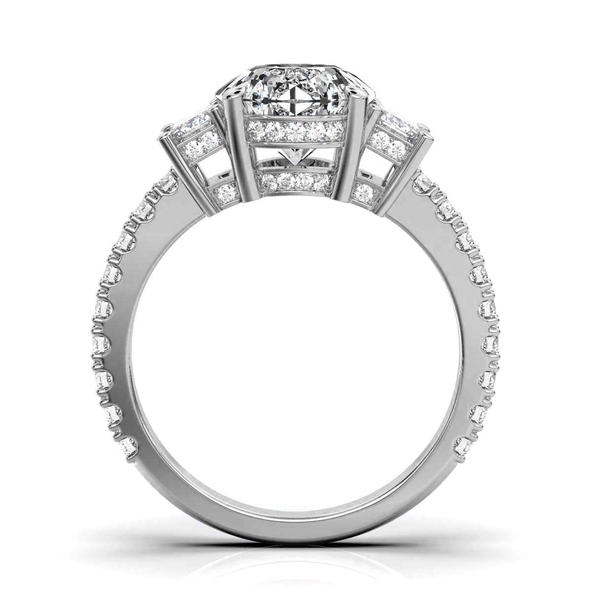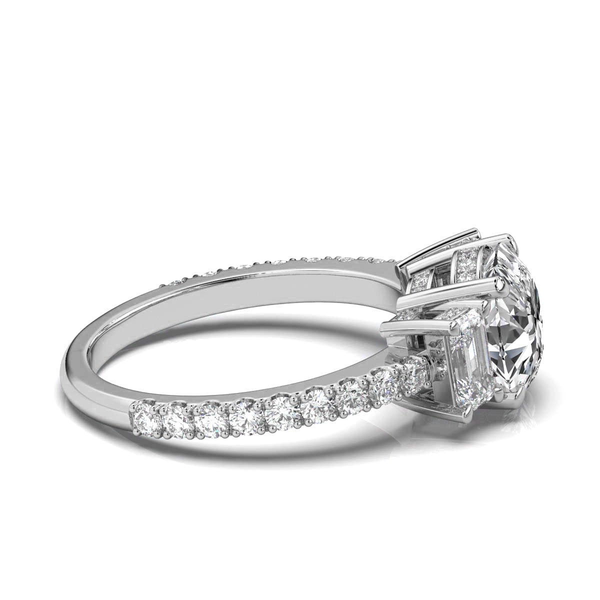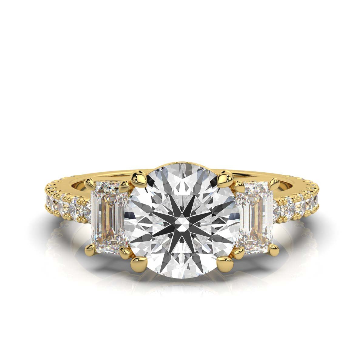 優雅而永恆, 18k 純金三石祖母綠形莫桑石鑽石戒指 是一部真正的傑作。 2.00 克拉圓形超切割莫桑石 這枚戒指的中心閃耀著 VVS1 淨度和 F 顏色. 令人驚嘆的 側石——祖母綠和圓形莫桑石——共重 1.07 克拉,增添了奢華精緻的感覺。