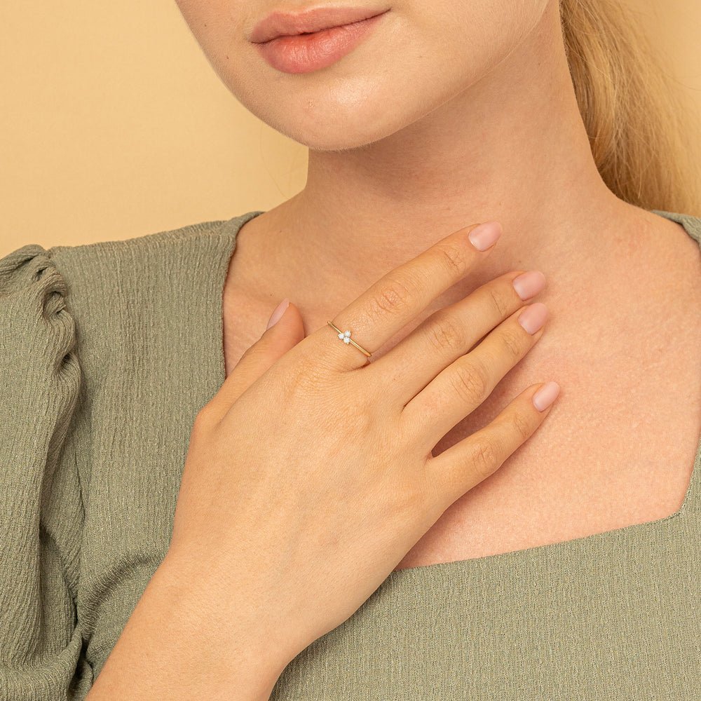 18K純金三鑽簇鑲戒指,鑲嵌0.09克拉天然鑽石(GH/VS-SI)。簇鑲尺寸4.5毫米。經BIS認證及GIA認證。三種金色可選。