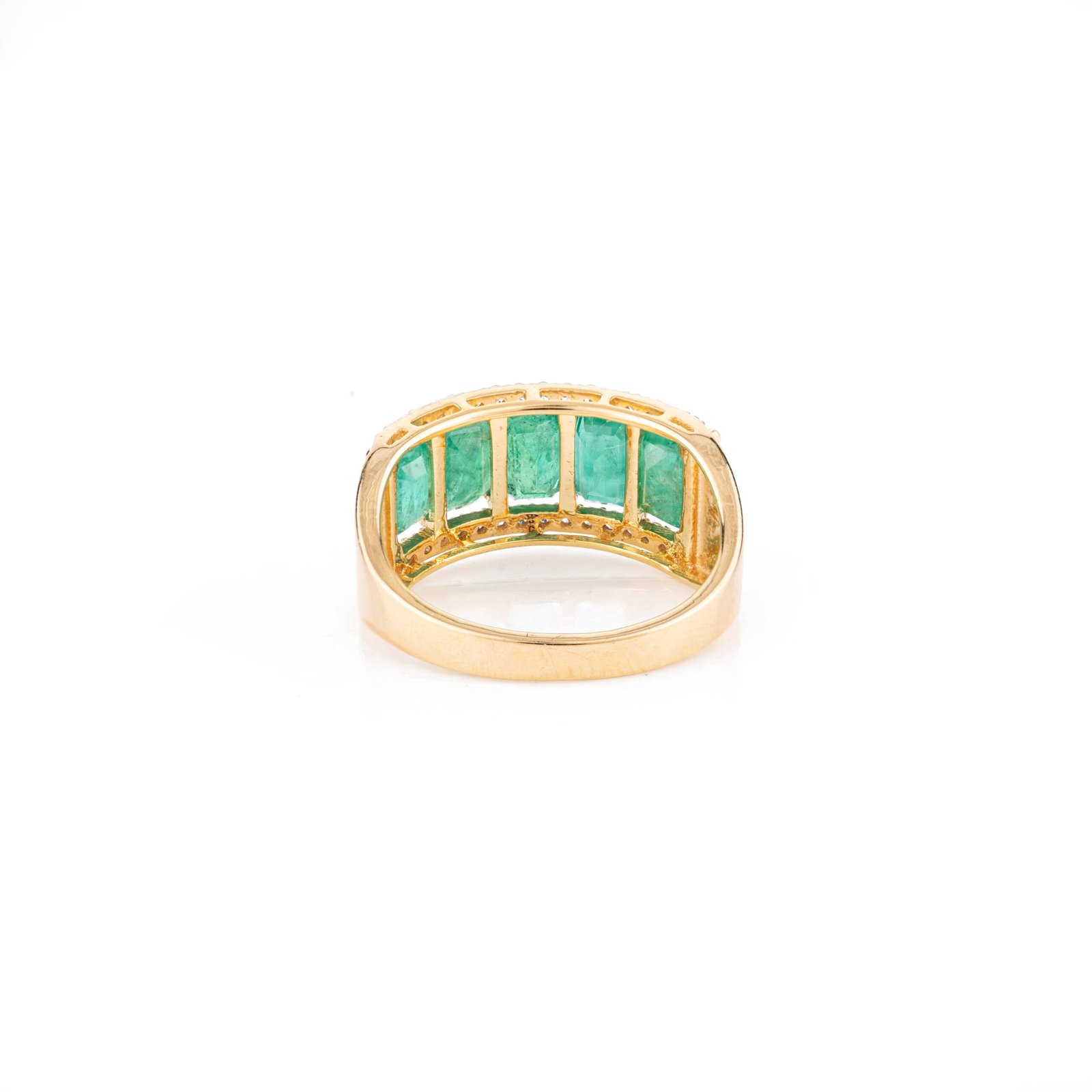 這 18k 純金五石祖母綠鑽石訂婚戒指 這枚瑰麗的戒指將純金的雋永優雅與祖母綠的璀璨魅力以及鑽石的璀璨光芒完美融合。這款戒指採用18K純白金打造,鑲嵌五顆璀璨奪目的八角形切割祖母綠,每顆尺寸為5.51 x 3.45毫米。這些祖母綠總重3.16克拉,以其濃鬱的翠綠和卓越的淨度而聞名,是這款優雅戒指的完美點綴。