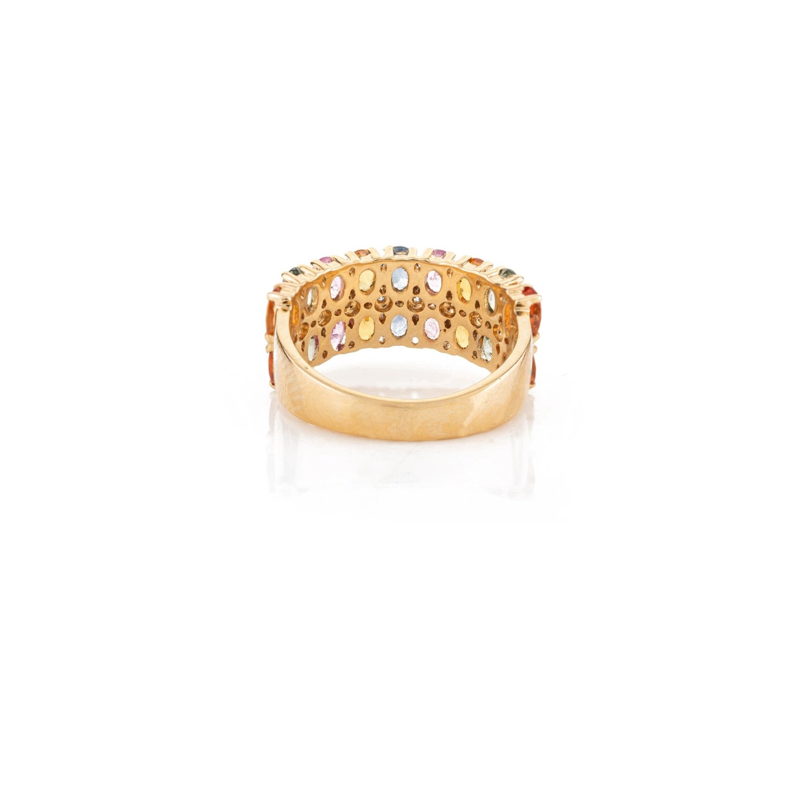 引人注目的 18k 純金寬頻戒指,鑲嵌著多色藍寶石和鑽石,為任何場合提供大膽而優雅的設計。