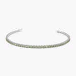 這款網球手鍊以經典的四爪鑲嵌,鑲嵌著色彩鮮豔的橄欖石。爪鑲設計使光線能最大限度地穿透寶石,從而提升其自然光彩,使其散發出明亮而充滿活力的光芒。橄欖石的艷麗綠色使其獨一無二、美不勝收,成為每個人都夢寐以求的珠寶配件。