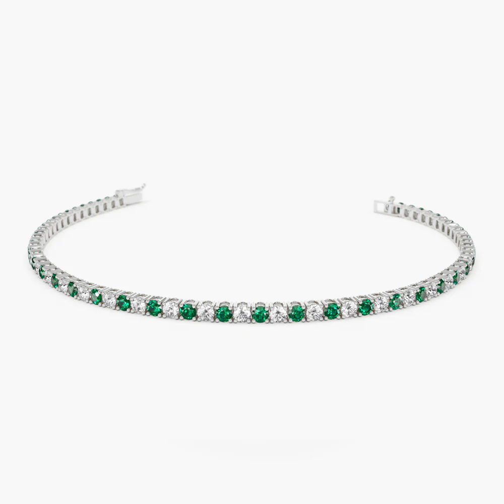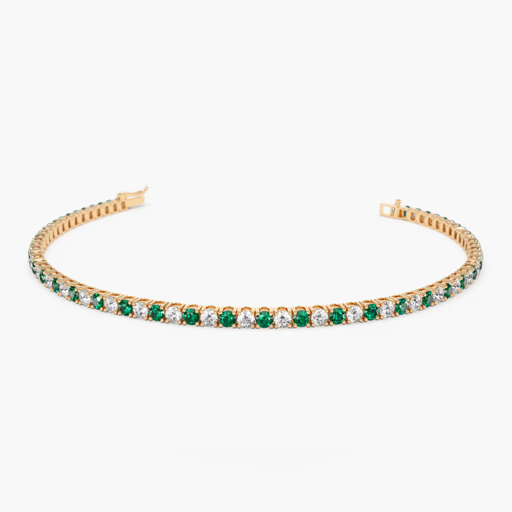 優雅的 18k 純金網球手鍊,鑲有爪鑲鑽石和祖母綠——永恆的光彩和精緻的精緻。