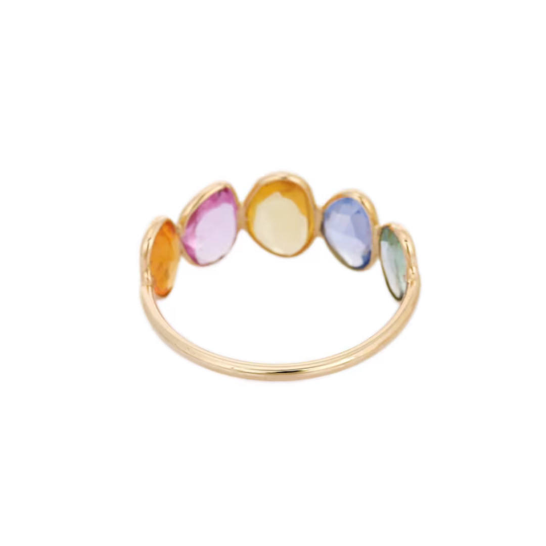 這款 18k 純金半永恆戒指色彩絢麗、獨具特色,鑲嵌著獨特的多顆藍寶石,非常適合鮮豔的疊戴或特殊場合。
