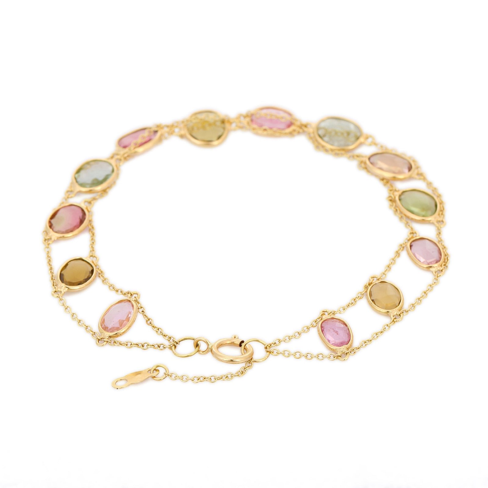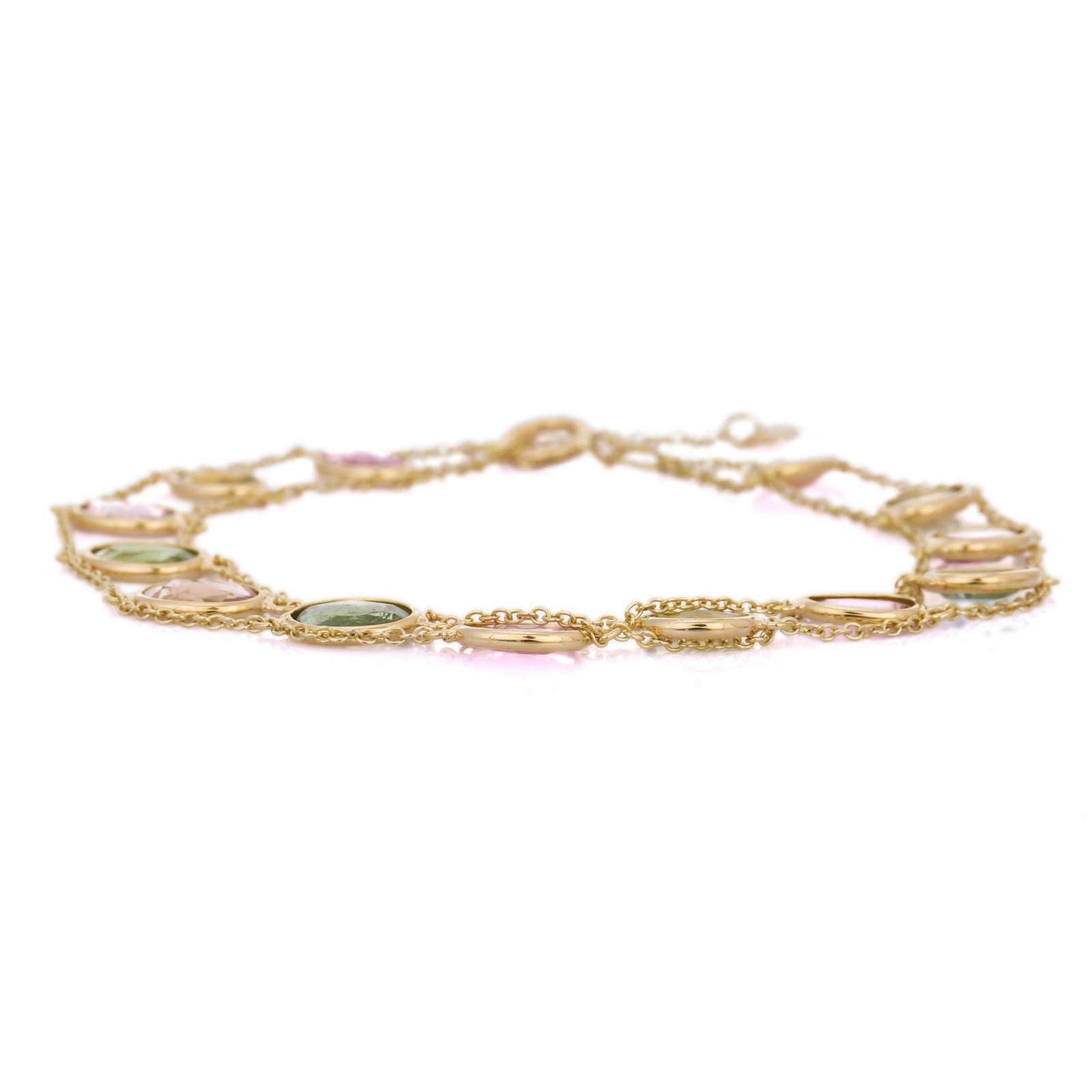 包邊鑲嵌不僅提升了每個碧璽的美感,更提供了穩固的支撐,確保其經久耐用,並有效防止日常磨損。可調長度的設計更添百搭性,讓手鍊能夠舒適地佩戴在任何手腕上。