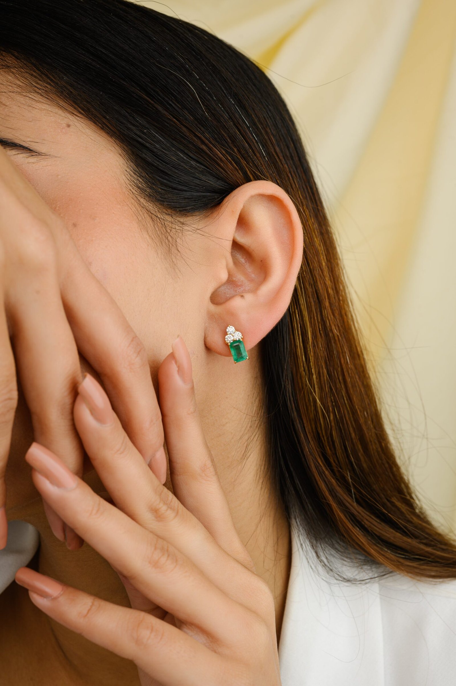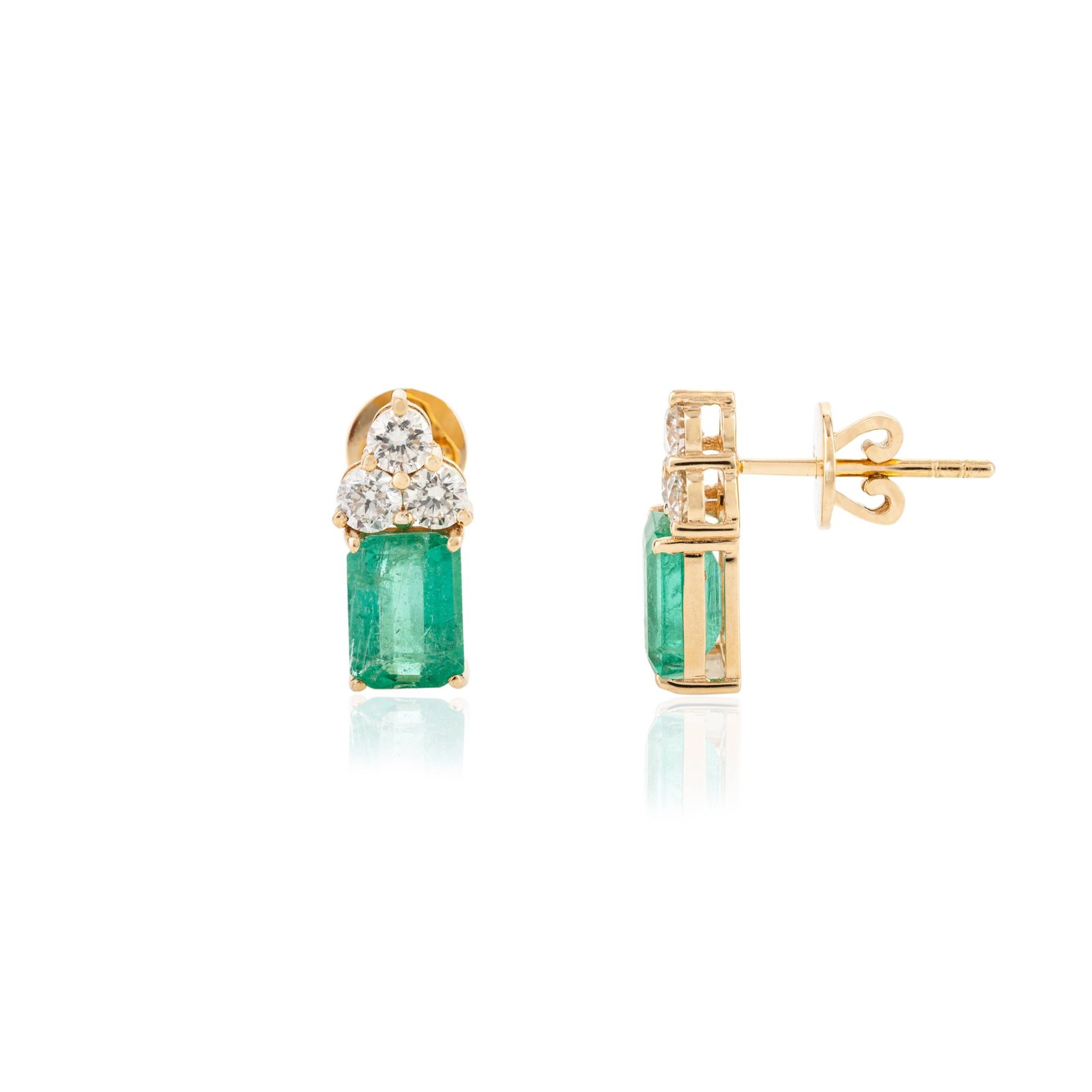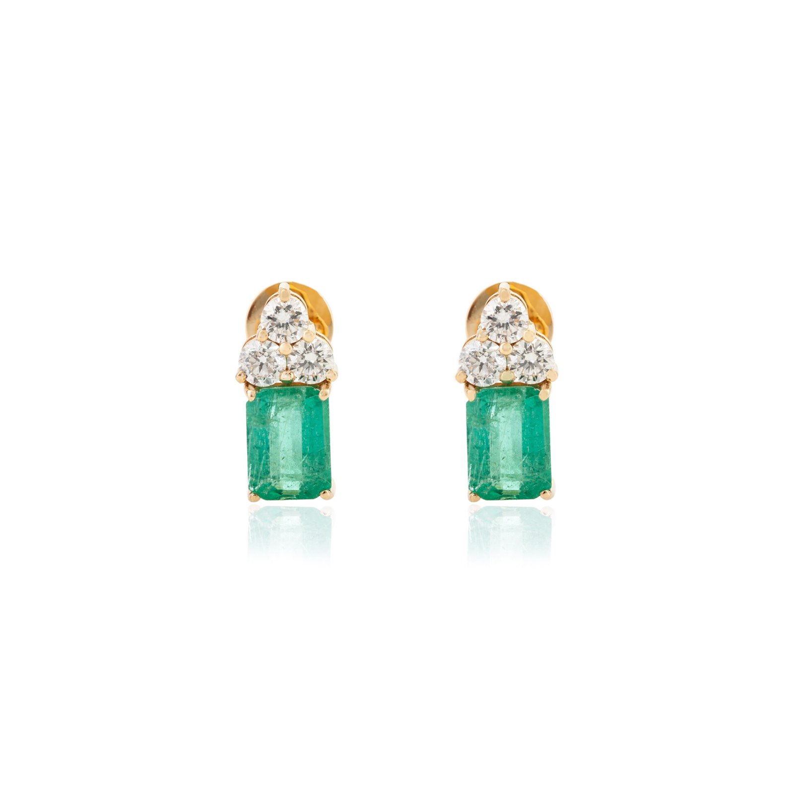 這款 18k 純金耳環採用鮮豔的祖母綠搭配三顆耀眼的鑽石,帶來精緻的奢華感和永恆的魅力。