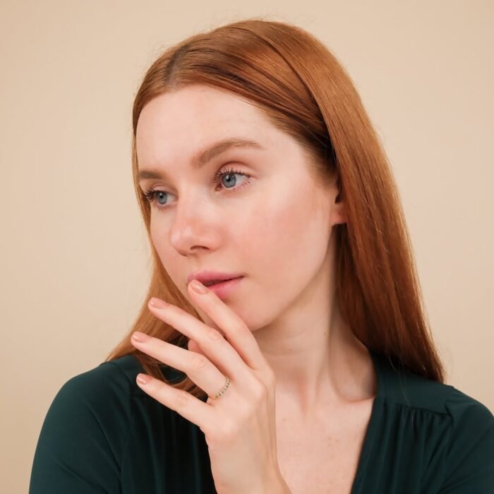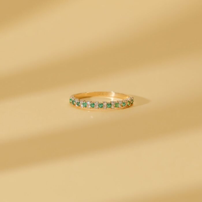 用這款手工製作的 18k 純金祖母綠與天然鑽石半永恆戒指—古典美感與現代精緻的完美融合。交替 天然祖母綠 和 明亮式切割鑽石,這枚戒指提供了深綠色色調的迷人對比 0.15克拉祖母綠 以及閃耀的光芒 0.13 克拉 G 色、SI 淨度鑽石.憑藉其 2.4 毫米寬 和 高度1.6毫米,戒指外觀大膽而精緻,非常適合日常佩戴或作為獨特的結婚戒指或週年紀念戒指。