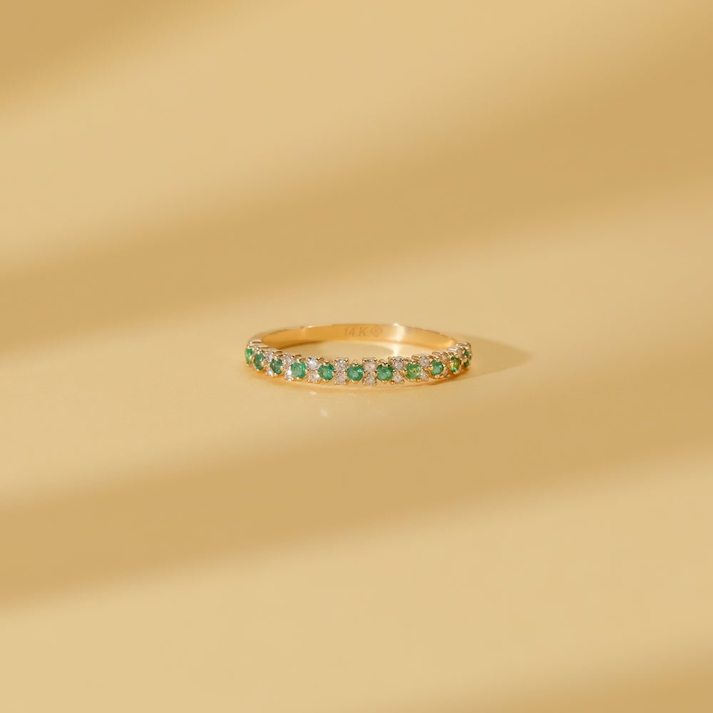 18K金半永恆戒指,鑲嵌0.15克拉祖母綠和0.13克拉G/SI級鑽石。經GIA和BIS認證。優雅可疊戴的設計。