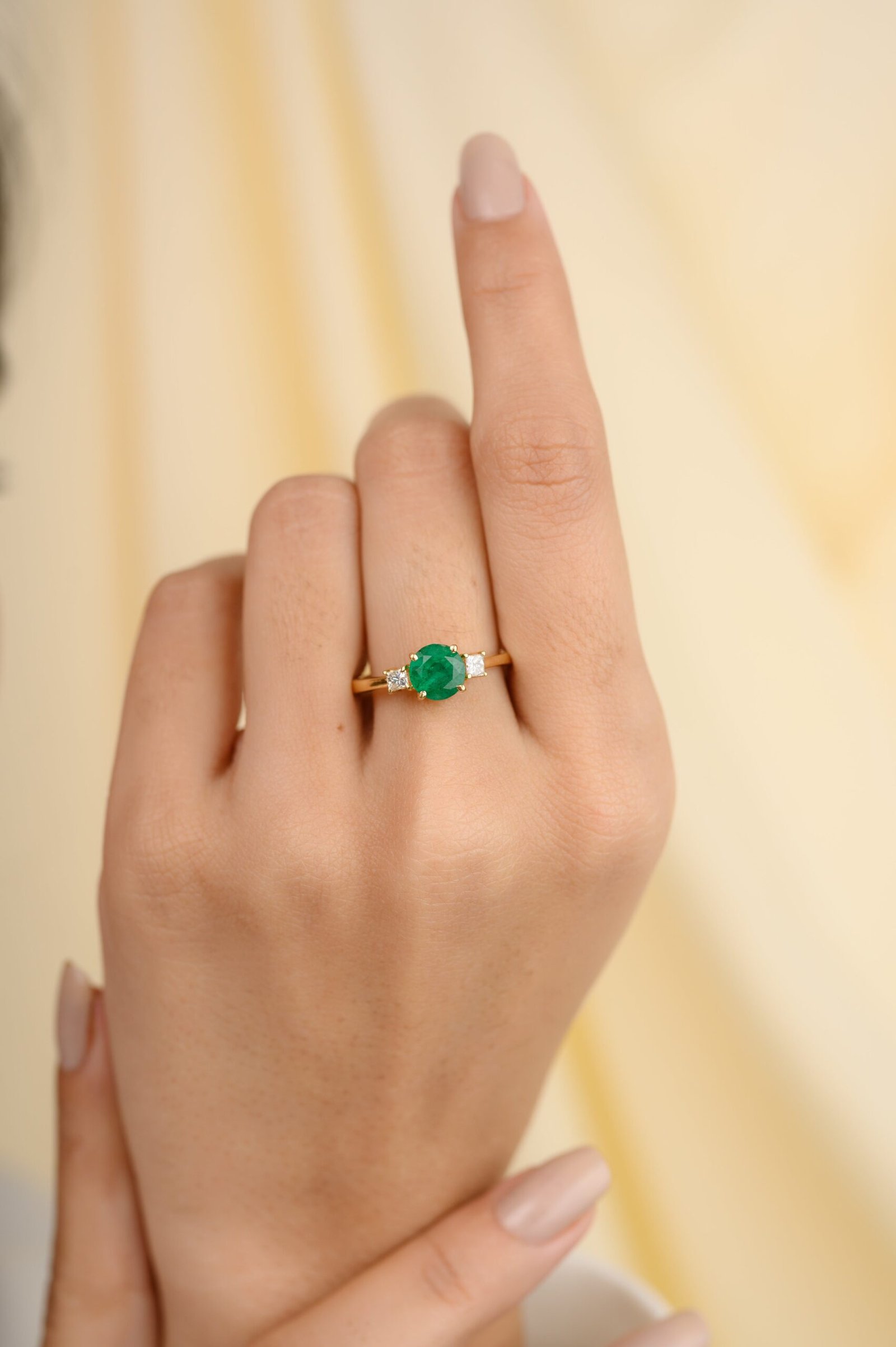 用 18k 純金祖母綠和鑽石三石訂婚戒指提升您的求婚,這是一款奢華的配飾,捕捉了永恆的美麗和愛情的精髓。
