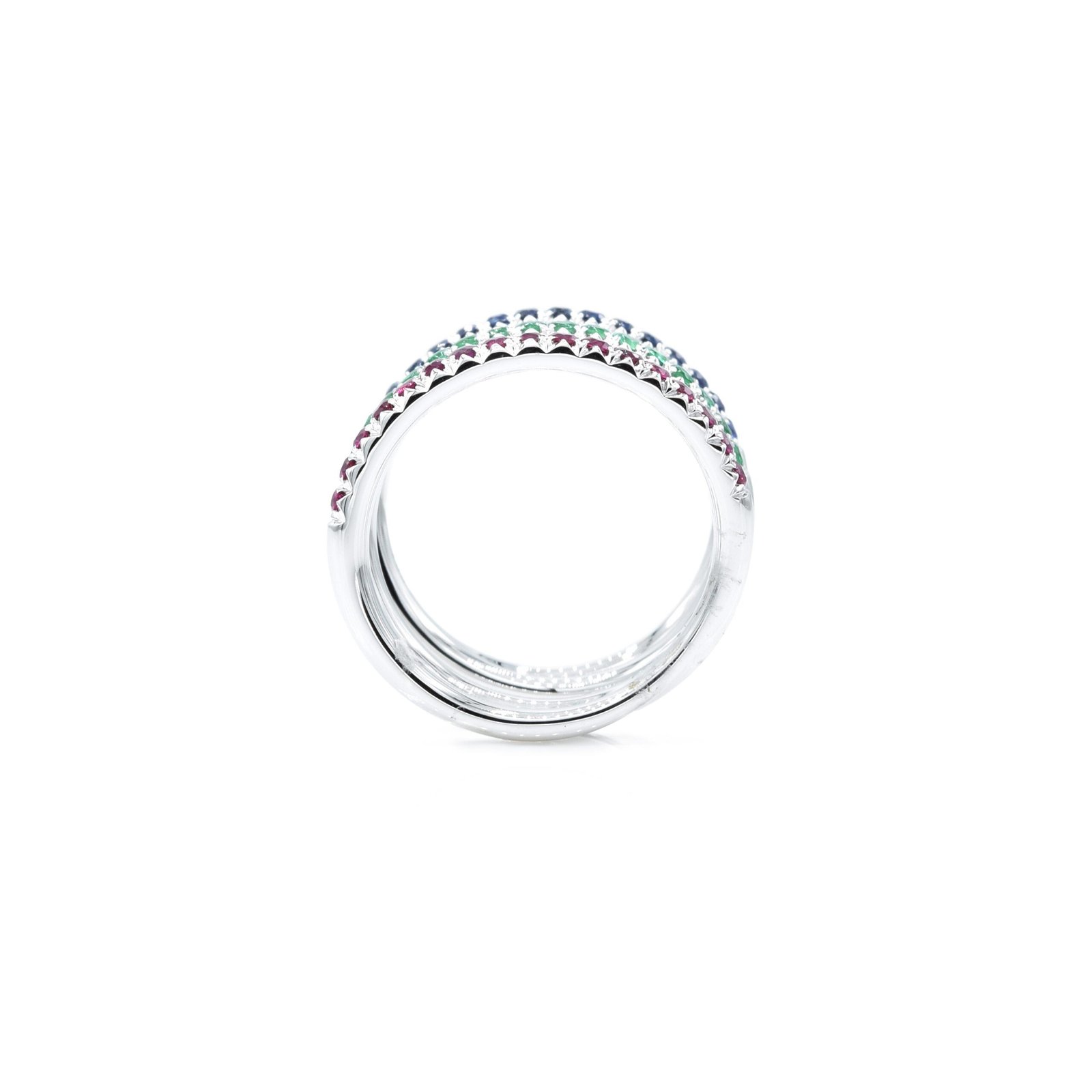 用三種最珍貴的寶石來慶祝其永恆之美 18k 純金紅寶石、綠寶石和藍寶石三重戒指。這件充滿活力且意義深遠的作品展示了三種天然寶石——火紅的紅寶石、茂盛的祖母綠和深藍色的藍寶石——每顆寶石都像徵著愛、智慧和力量。它們鑲嵌在一枚光滑的18K純金戒圈上,彼此交相輝映,美不勝收,卻又各自閃耀奪目。