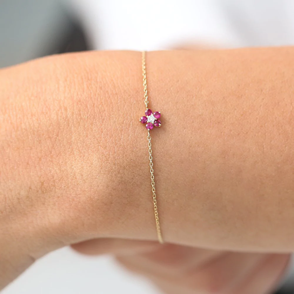 精緻的 18k 純金手鍊,飾有紅寶石和鑽石花朵吊飾——打造永恆的優雅、鮮豔的色彩和女性之美。