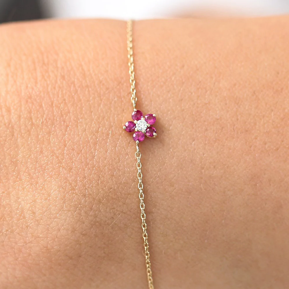 18k 純金紅寶石和鑽石花朵吊墜手鍊