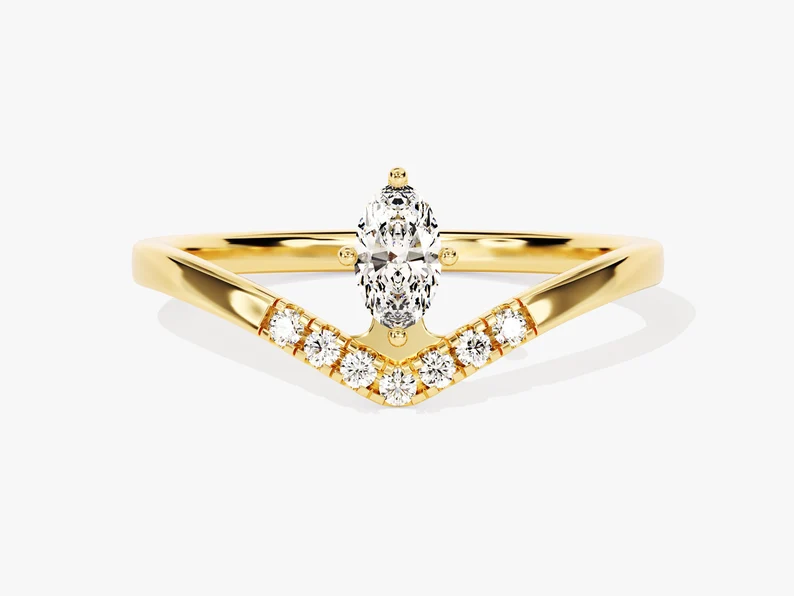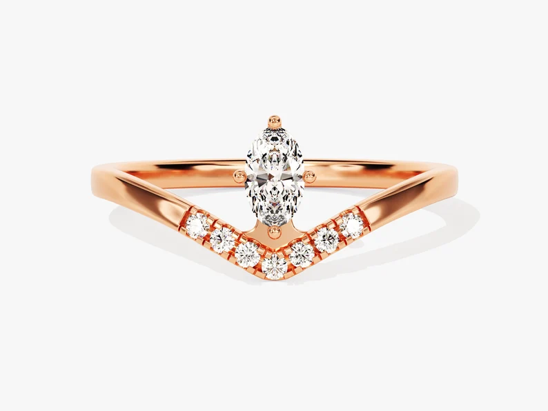 具有獨特的 叉骨輪廓,這個嵌套環鑲嵌著 0.28克拉天然鑽石 混合 橢圓形和圓形切割. 鑽石經過精心挑選, GH 顏色和 VS-SI 淨度,閃耀非凡,淨度非凡。優雅的V型設計,完美搭配訂婚戒指,提升戒指美感;亦可獨戴,象徵希望與好運。