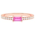 這件令人驚豔的作品,中心鑲嵌著重達0.24克拉的華麗粉色藍寶石。柔和的粉紅色色調使其顯得格外柔美迷人,與0.16克拉的璀璨鑽石交相輝映。整體效果與溫暖的玫瑰金形成鮮明對比,更顯出戒指的美感。