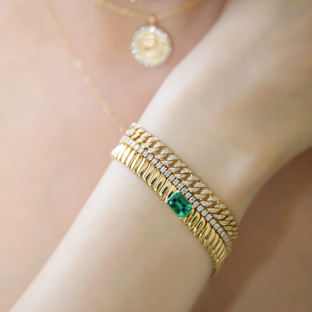 精緻與魅力是迷人的 Zoe 手鍊(鑲有祖母綠)為佩戴者帶來的。