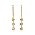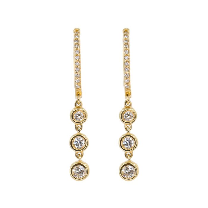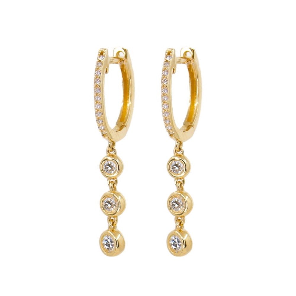 每隻耳環都配有 大環設計,飾有 鑲嵌三顆莫桑石鑽石 優雅地懸垂,增強了動態和閃耀。 D 顏色和 VVS1 淨度這些鑽石散發著璀璨的光芒,其火彩和光澤可與天然鑽石媲美。 三重邊框設計 增添了一絲精緻,使這些耳環成為特殊場合和精緻日常穿著的完美配件。