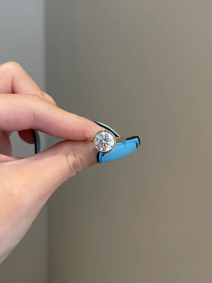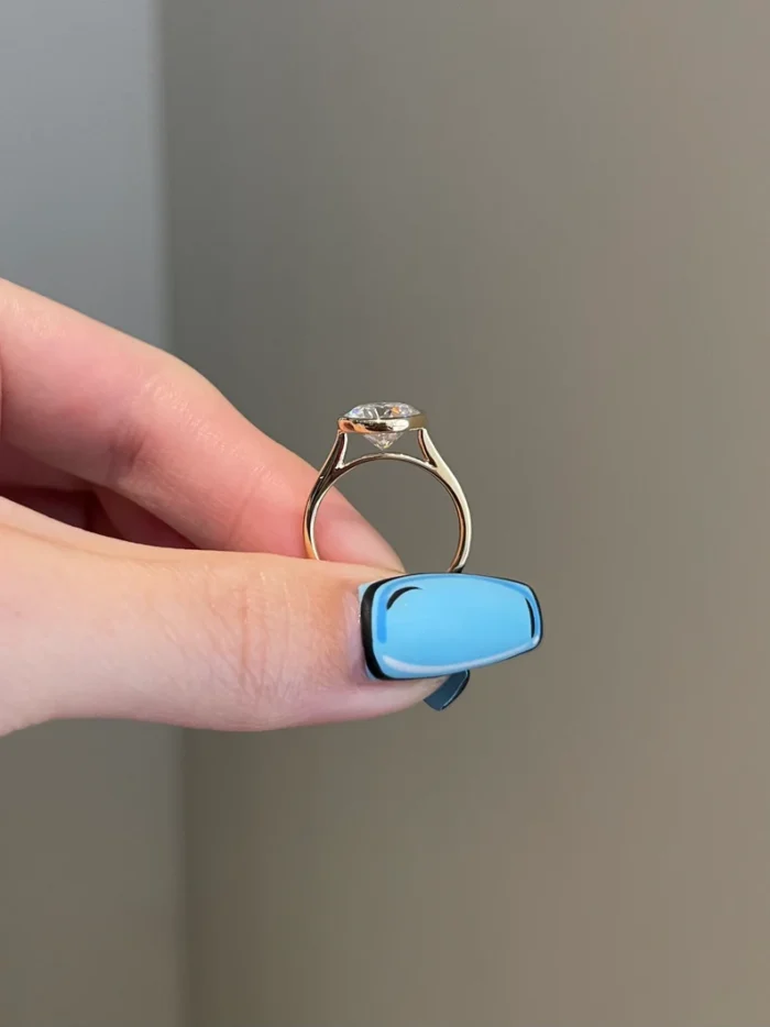 這款令人驚嘆的作品採用優質 14K 黃金製成,中央鑲嵌有一顆 2.5 克拉的圓形莫桑石,並鑲嵌在邊框中,以增強寶石的光彩。