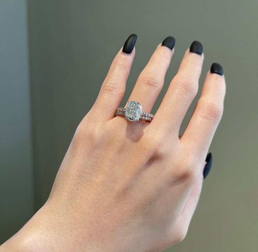 這款 14K 金 4 克拉墊形切割碎莫桑石訂婚戒指光彩奪目,設計大膽奢華,是難忘愛情的完美象徵。