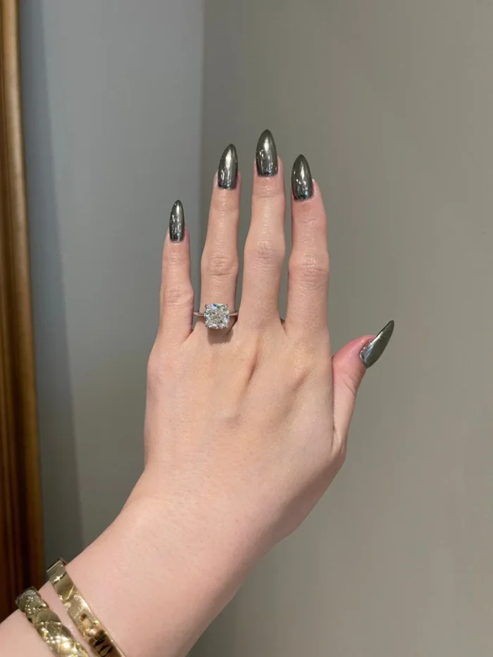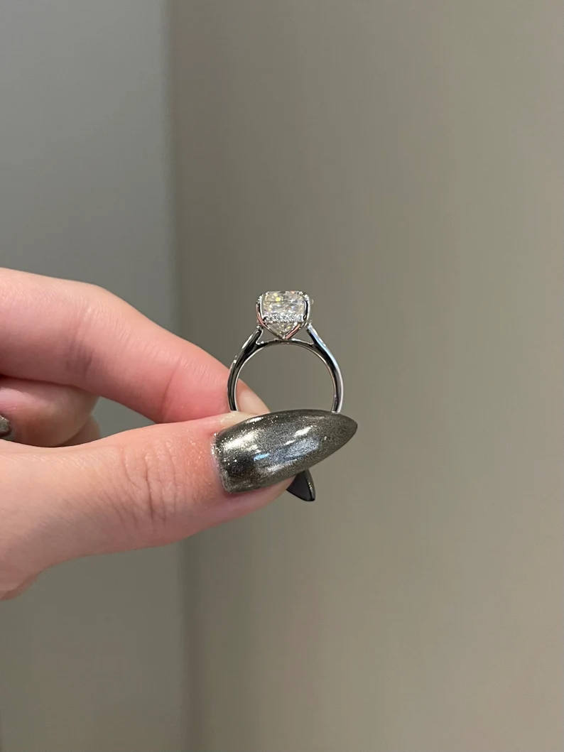 這款 4 克拉墊形切割莫桑石訂婚戒指閃耀著奪目、經典美麗,是喜愛大膽、優雅和持久風格的女性的理想之選。