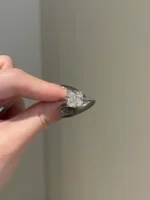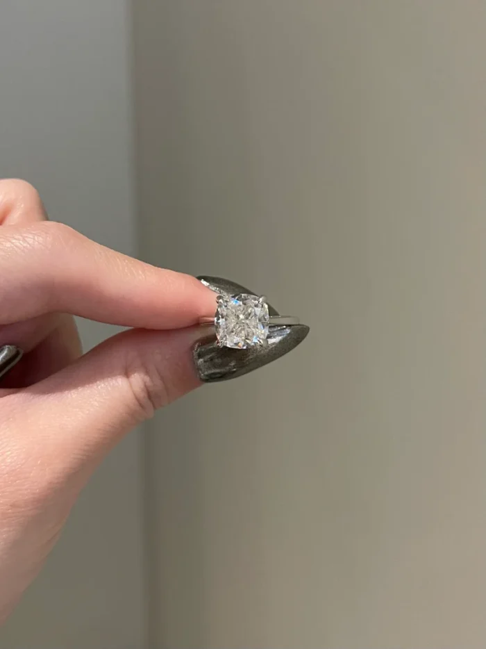 其核心是一顆華麗的4克拉墊形切割莫桑石,以其遠超傳統鑽石的璀璨光芒和火彩而聞名。墊形切割更增添了復古氣息,呈現出柔和圓潤的邊緣,營造出浪漫的氛圍。